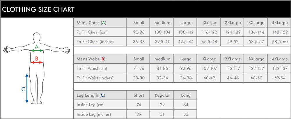 | Chest To Fit (ins) | 36-38 | 40-42 | 44-46 | 48-50 | 52-54 | 56-58 | |